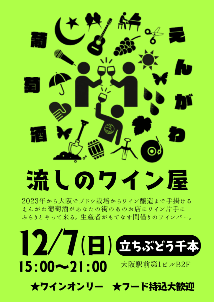 【イベント】12.7sun 流しのワイン屋(大阪梅田) 2025年11月20日 最終更新日時 : 2025年11月20日 engawawine 大阪駅前第1ビルの地下2Fで10年以上「立ち飲みワイン」のジャンルで続けておられる【立ちぶどう千本】さん。オープン間もない頃のこちらのお店で働き始めたことが僕の今に繋がっています。当日は千本さんを間借りしてえんがわのワインをグラス販売いたします。 ⚠️千本さんは定休日ですのでえんがわ葡萄酒の間借りワインバー営業です。⚠️フードありません🙇♂デパートさんで色々ご用意の上お越し下さい。⚠️お支払いは現金のみでお願いします。 立ち飲みのお店です。お含みおき下さい。 \ 最新情報をチェック /